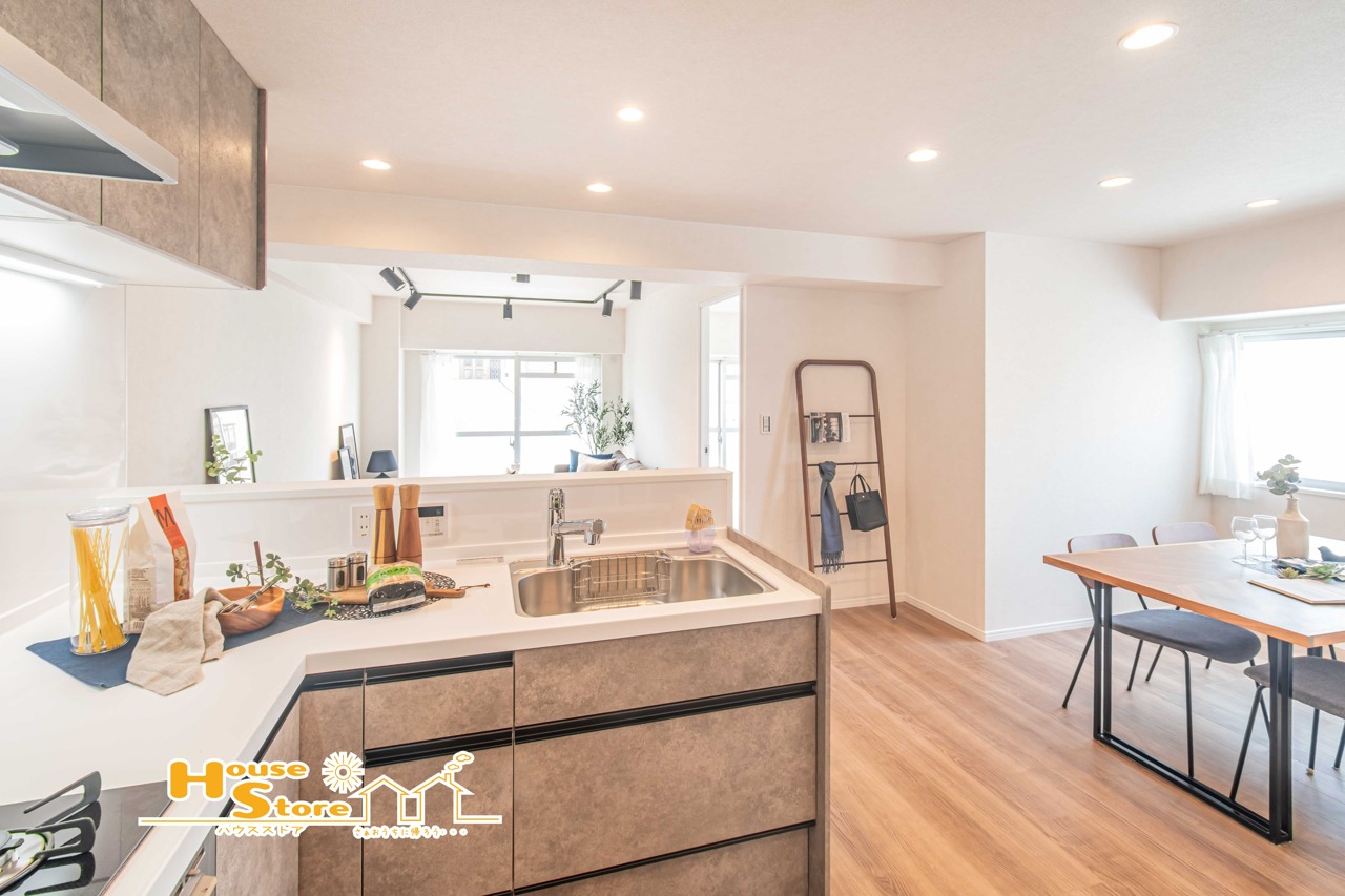 L型キッチンはシンクとコンロの移動をコンパクトにでき、調理や盛り付けなど一連の動線をスムーズに行うことができます。