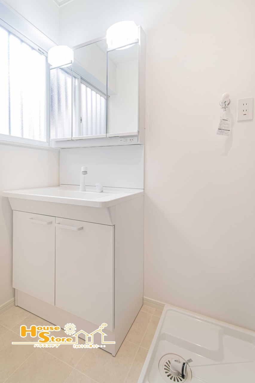 朝の忙しい時間にも快適に身支度ができる三面鏡付き洗面台。窓から明るい光が差し込む心地よい空間で、ゆとりをもって準備が進められます。