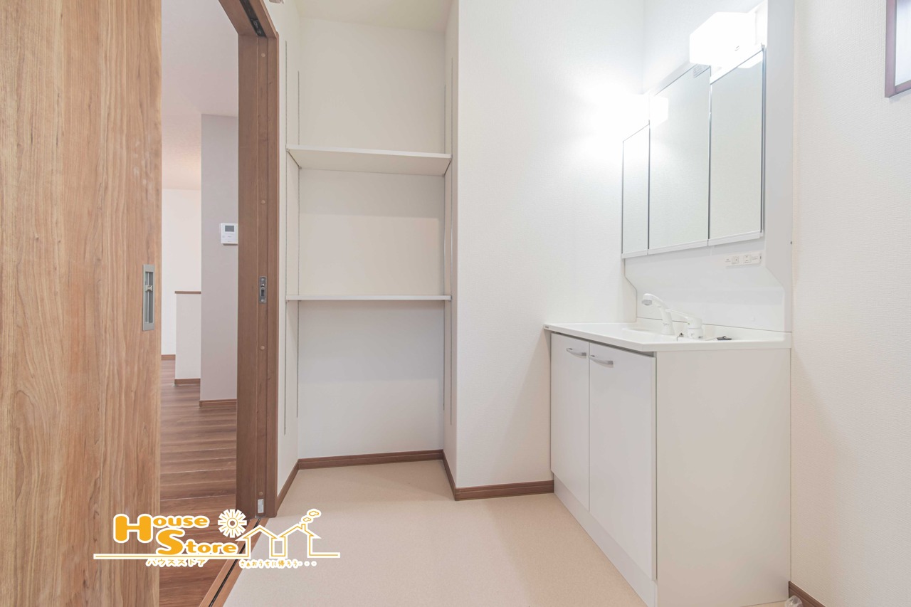 ゆとりの広さを確保した洗面室は、清潔感あふれる洗面化粧台に収納スペースを設けて身支度に忙しい朝もスッキリと使用することができます。