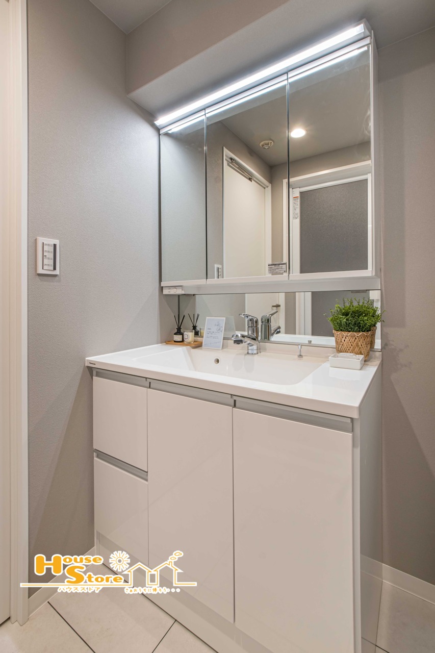 終ぬを備えた使い勝手の良い洗面室。朝の身支度から帰宅後のケアまで快適に行える清潔感のある空間です。