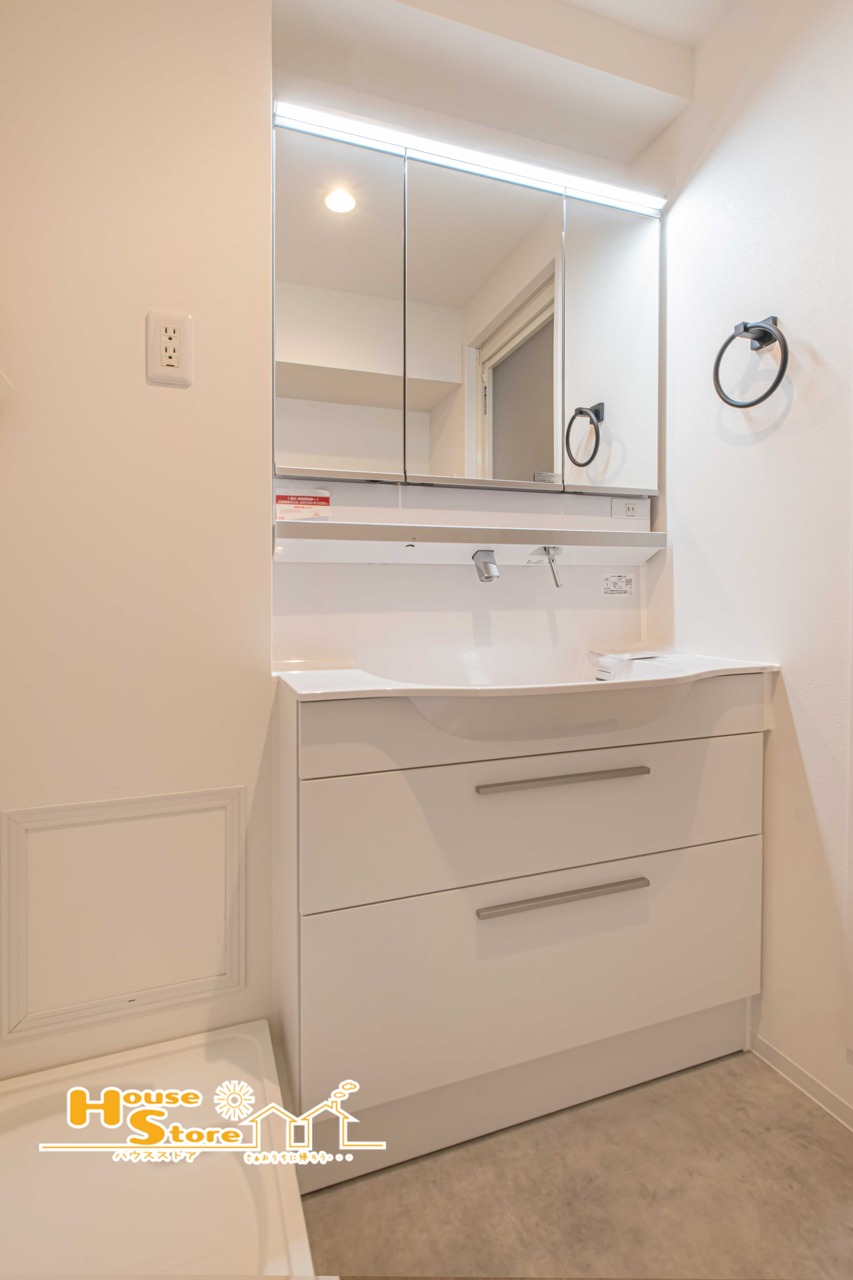 広めの三面鏡付き洗面台で身支度もしやすく、ゆとりのあるスペースで日用品も収まりやすい仕様。散らかりがちな洗面所も快適にお使いいただけます。