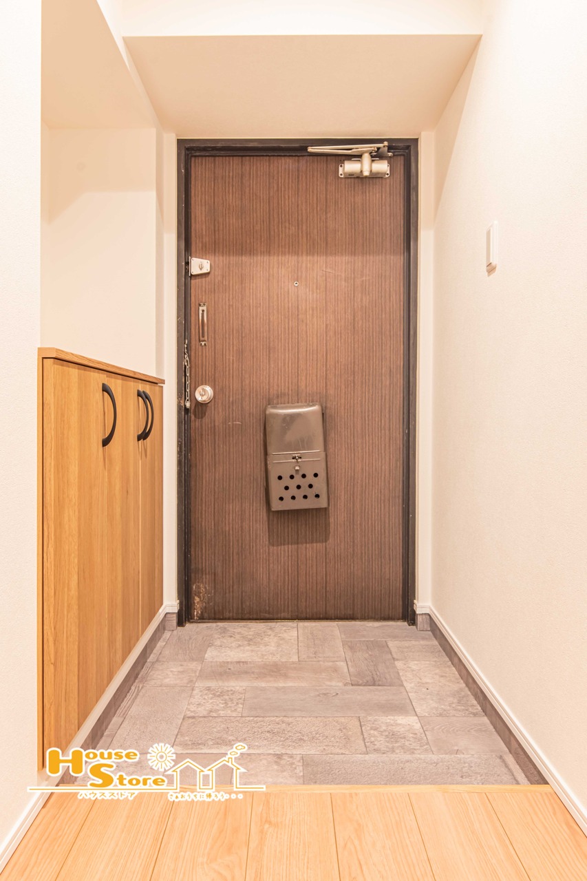 玄関収納付きのすっきりとした玄関。収納の上はカウンターになっており、小物などを飾ってお家の顔である玄関をより素敵な空間に演出できます。