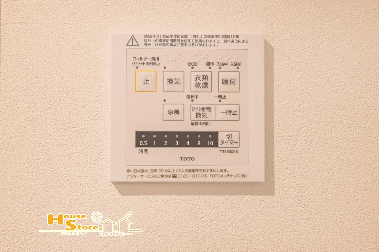浴室換気乾燥暖房機付きで季節を問わず快適。雨の日のお洗濯や寒い時期の入浴も安心です。