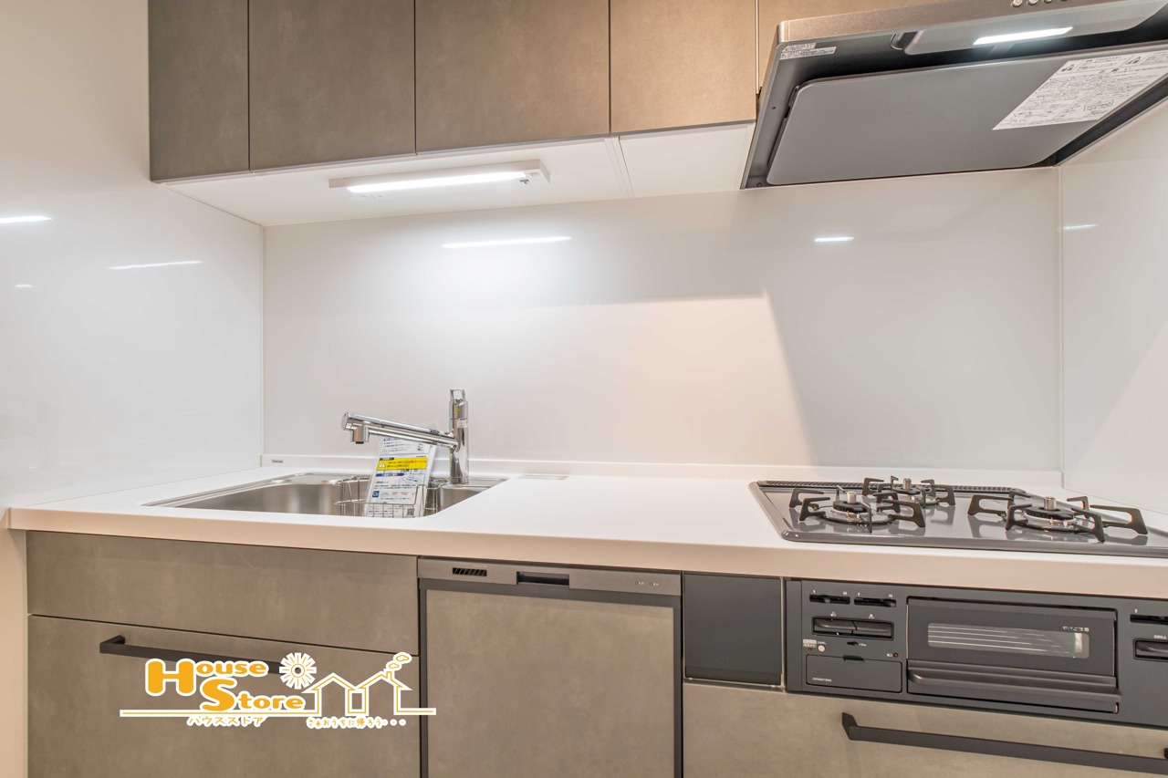 食器洗浄機付きのシステムキッチンでお料理も快適に。お手入れもしやすく収納も豊富で、見た目だけでなく使い勝手の良いキッチンです。